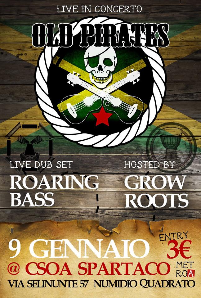 Una serata dedicata alla musica Reggae suonata dal vivo con 2 gruppi fantastici . Apriranno il concerto i Roaring Bass con un progetto musicalmente innovativo, profondamente legato ai principi del Roots Reggae. Con uno stile basato sul Dub e componenti elettroniche. A seguire il piatto forte della serata! gli OLD PIRATES progetto parallelo di Giulio Ferrante (basso , voce e cori delle Radici nel Cemento) che con la sua band vi porteranno in un viaggio nella musica giamaicana dal calypso al reggae passando per rocksteady e ska, attraverso i grandi classici del genere piú brani originali! a condire il tutto le selezioni reggae a 360° prima e dopo il concerto del Grow Roots Sound!!