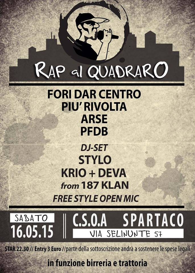 Continuano le serate rap al centro sociale Csoa Spartaco! Questo sabato vedrà i Fori dar Centro, Arse/Occhi Viola e dj Muf, Più Rivolta e Pfdb. A seguire dj set a cura di Deva,Krio e Stylo from 187 Klan. FREE STYLE OPEN MIC