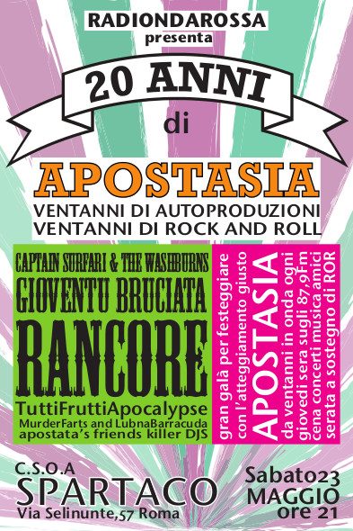 E come annunciato in diretta radio, gli Apostati hanno il piacere di annunciare la festa dei 20 anni della trasmissione in sottoscrizione di Radio Onda Rossa!