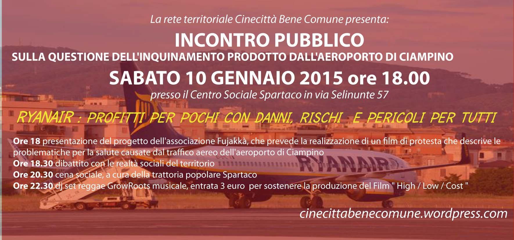 Sabato 10 Gennaio 2015 si svolgerà un incontro pubblico per discutere delle problematiche causate dall’inquinamento prodotto dal traffico aereo delle compagnie Low Cost dell’aeroporto di Ciampino. L’iniziativa nasce insieme al coinvolgimento delle realtà sociali del territorio, in particolare con il Comitato per la riduzione dell’impatto ambientale dell’aeroporto di Ciampino, Città in Comune e l’associazione Fuyakka’ che ha lanciato una campagna di autofinanziamento per finanziare la realizzazione di un film in 5 episodi che descriva le criticità dell’aeroporto di Ciampino.